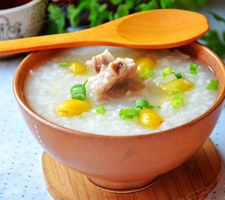 食材:大米50g、糯米30g、豬肋排100g、白果30粒、鹽適量、蔥花適量、雞精少許