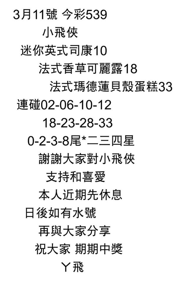 今彩539 2020/10/23 Usagi 精選3碼 全車 供您參考