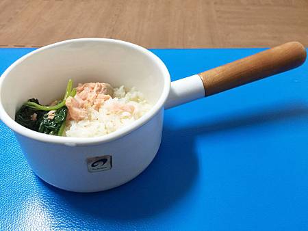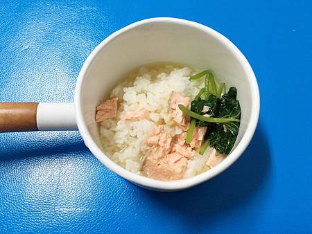 食材:白飯、鮭魚、蕃薯葉、紅蘿蔔、賓阿骨高湯
