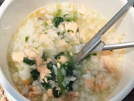 注意:很多媽媽是把生鮭魚熬粥,然後發現很腥,孩子都不愛吃,所以建議鮭魚先處理過,我都習慣用烤箱烤鮭魚,烤過後再熬粥就不會腥了。