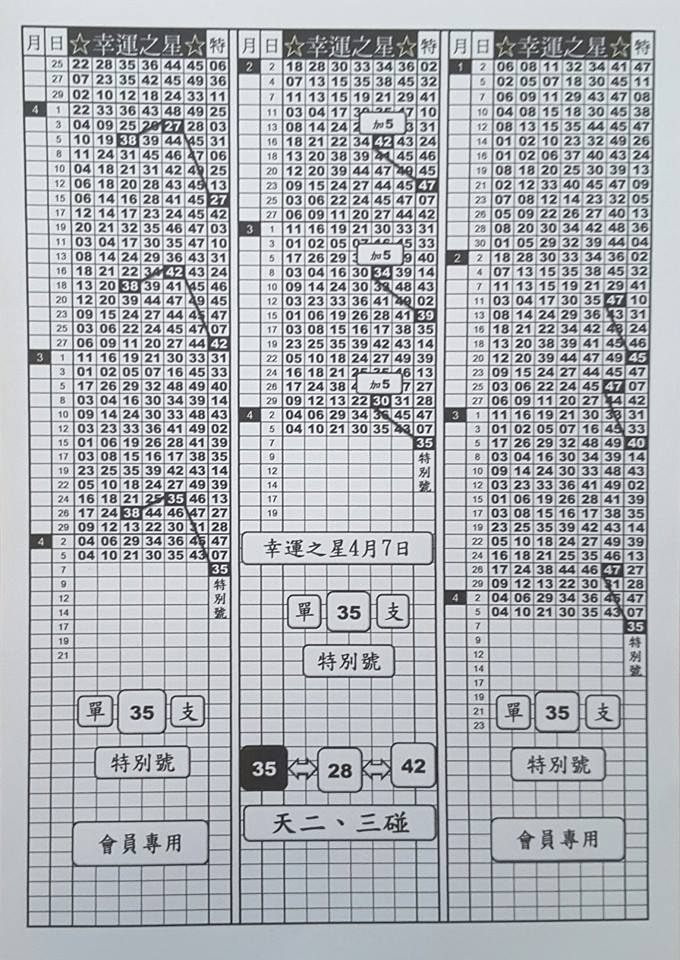 4月7日六合彩 特別號 5尾 主35 副05,15,25,45 $$$$$$$天二,三碰(35)×28×42