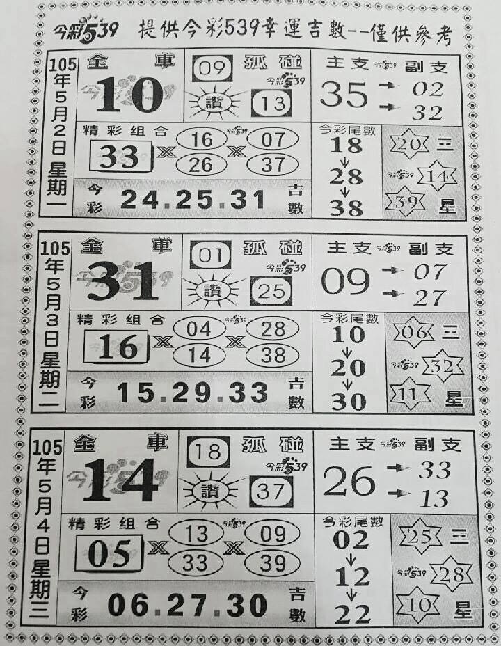 今彩539 2020/10/05 吉祥報分享 供您參考