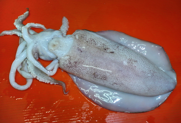 魷魚是噴墨家族裡,外型稍微細長的!它的軀幹個上半部較寬、尾端呈尖形,特色是尾鰭會呈現明顯的三角形,有兩根翹出來的伸縮性觸腕,另外八支則是無法伸縮的腕。