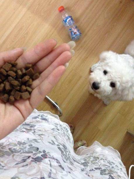牠從來不吃放在地上碗裡的飼料,必須要把飼料放手心裡一顆一顆喂, 還必須說「再吃一顆小寶貝」。