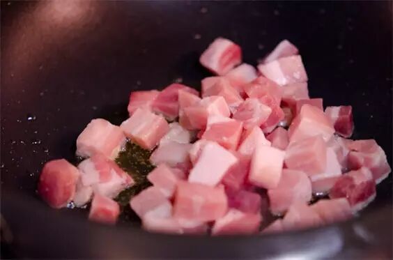 2、加熱油鍋,放豬肉進去翻炒至顏色變白。