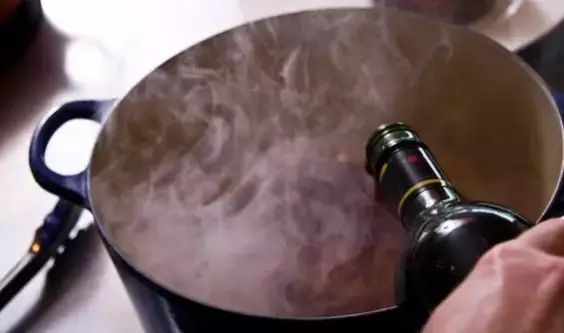 5、把半瓶紅酒加進去,煮到紅酒剩下2/3的時候,把搗碎的西紅柿放進去,中火煮15分鐘。
