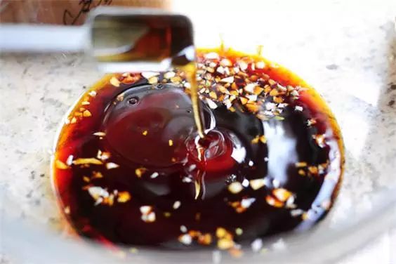 3、加蒜末、2茶匙米醋、2湯匙芝麻油和1/2茶匙辣椒油。
