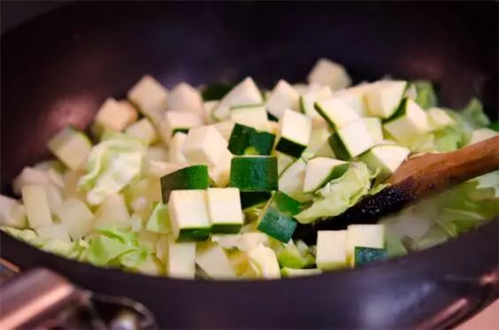 3、加包菜、洋蔥、西葫蘆和土豆泥,炒軟炒熟。