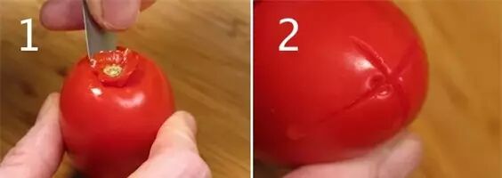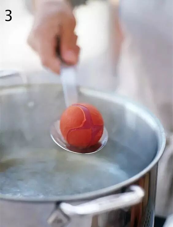 1、西紅柿洗凈,挖掉頭部,在底部劃十字,在開水中焯20秒鐘,直到果皮和果肉分離。