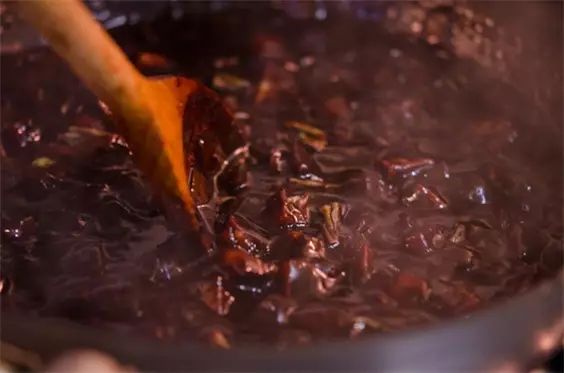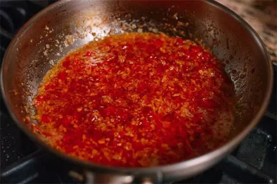 3、把3/4杯植物油加進去,放入200克辣椒片和糖,加2湯匙醬油,小火熬煮,待醬汁收干,辣椒醬就做好了。