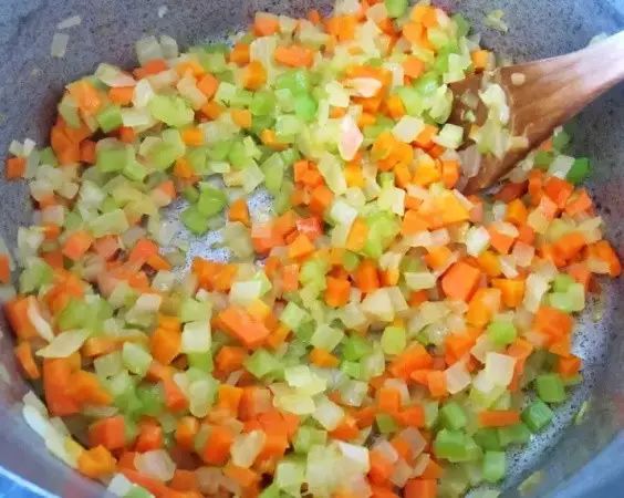 4、胡蘿蔔、芹菜和洋蔥切丁,鍋里加植物油燒熱,加蒜爆香,把蔬菜放進去,小火煸炒,加鹽、白糖,炒大概5分鐘。