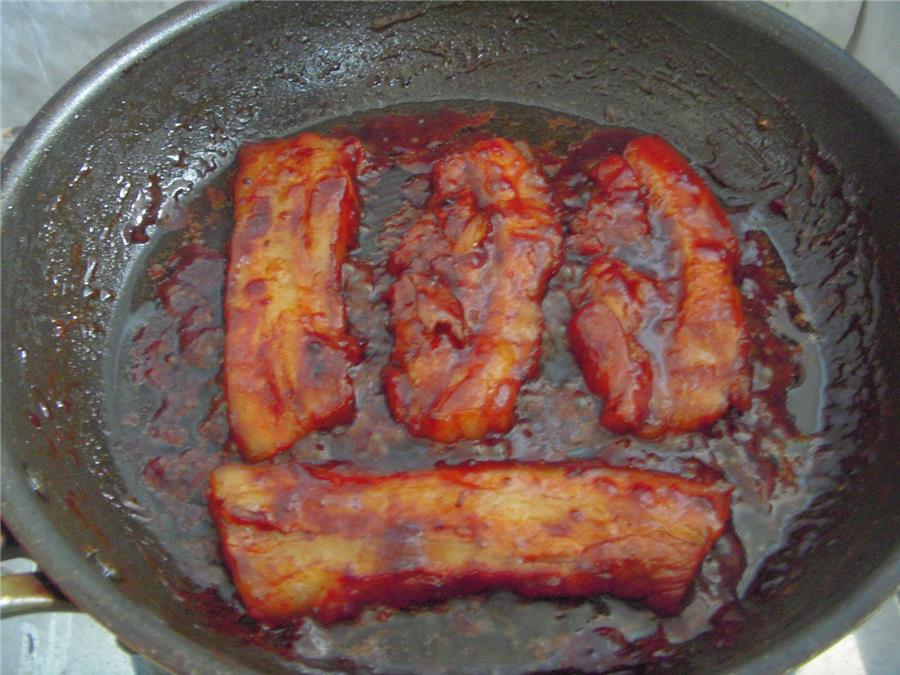 6)把制好的叉燒片回鍋小火煎至表面微帶點焦