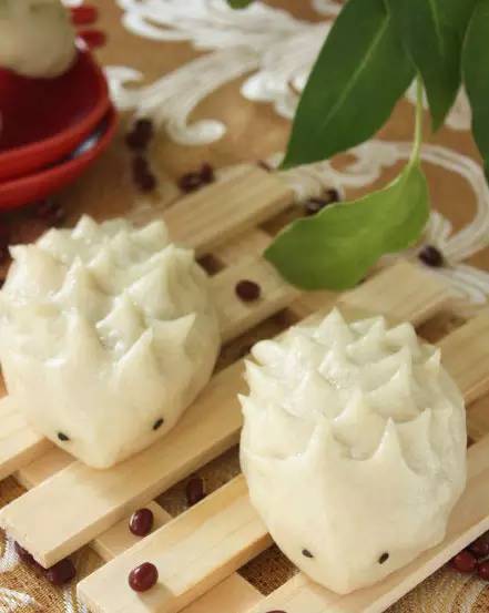 所有原料放在一起揉成麵糰。醒發半小時,搓條下成小劑子,包入花生餡,搓成象刺蝟一頭尖的形狀。
