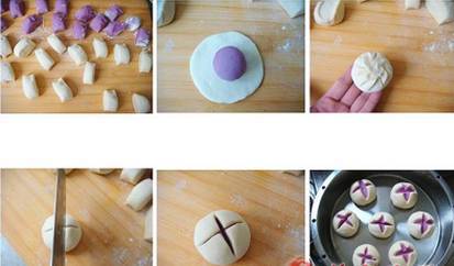 9 取一白麵糰擀成圓形,放入揉圓的紫薯麵糰