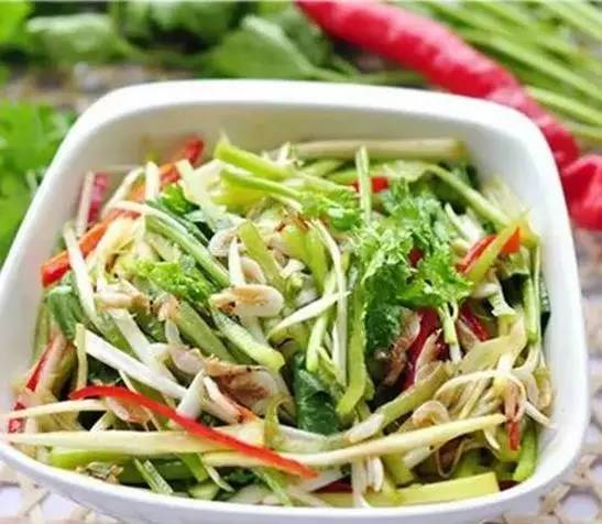 3、1.5勺生抽、1勺醋、小半勺糖和蒜蓉充分拌勻成濕料,將2料撈出,輕輕擠干水分放入拌勻,上桌前滴幾滴麻油即可