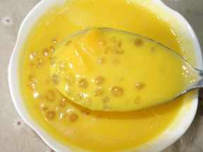 7. 將芒果牛奶倒入盛西米的碗中,再放入剩下的芒果肉。