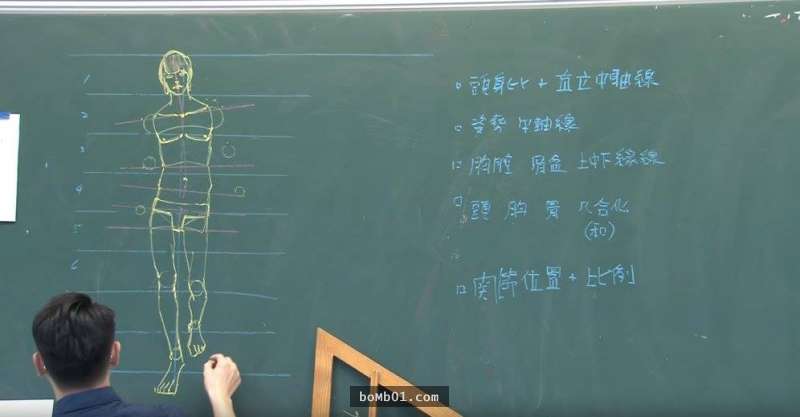 有一名視覺傳達設計系的老師鍾全斌,在臉書上分享了很多超神圖片。這些圖片是他在「藝用解剖學」這門課上,在黑板上用粉筆一筆一筆細緻繪出的人體透視圖,每個看過的人都驚呼:「好強的板書」。