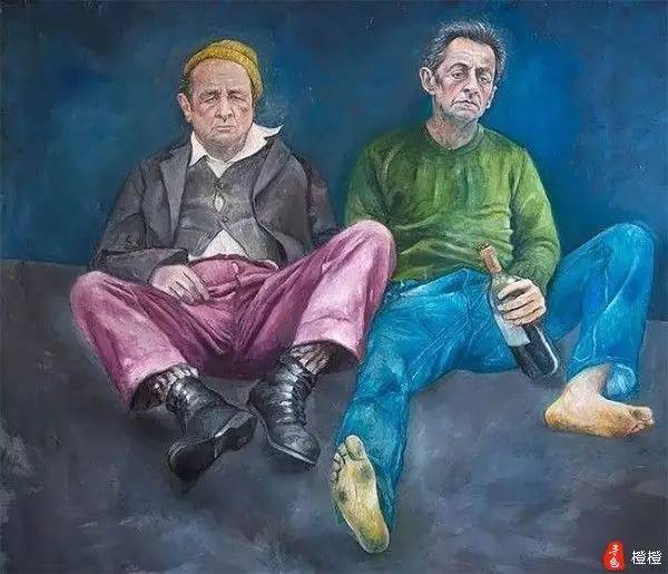 最不濟的,要數兩位法國前總統,奧朗德與薩科齊,手握酒瓶醉倒街頭,與流浪漢無異。Omari產生這個創意是由他自己的流離失所經歷推動的,而所有好的藝術,都能夠讓人產生思考和反省。(上圖中為難民版的兩位法國前總統,奧朗德與薩科齊。)