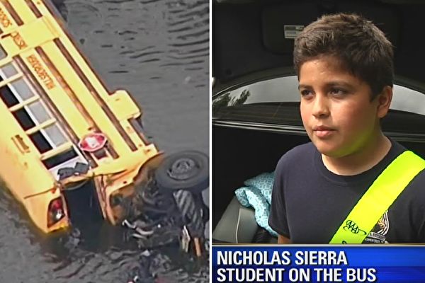 滿載27個學生的校車掉進了鱷魚出沒的池塘,10歲的尼古拉斯毫不驚慌,在警察趕到之前,救上了三個小孩。(視頻截圖/大紀元合成)