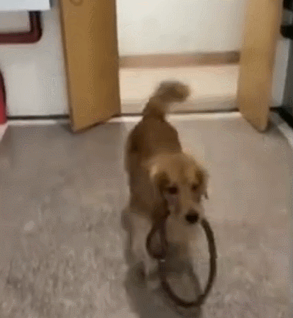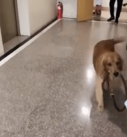 這條金毛都懂得出門要帶牽引,雖然是準備自己出去遛自己,但是也是叼著牽引繩的,當狗狗走到電梯口突然看到主人在那站著,好尷尬!不過金毛瞬間就反應過來了,搖著尾巴繞著主人轉了一圈:“嗨!鏟屎的,好巧啊!你也準備出門嗎?一起啊!”