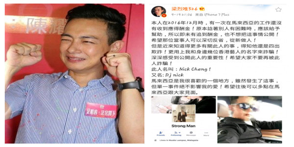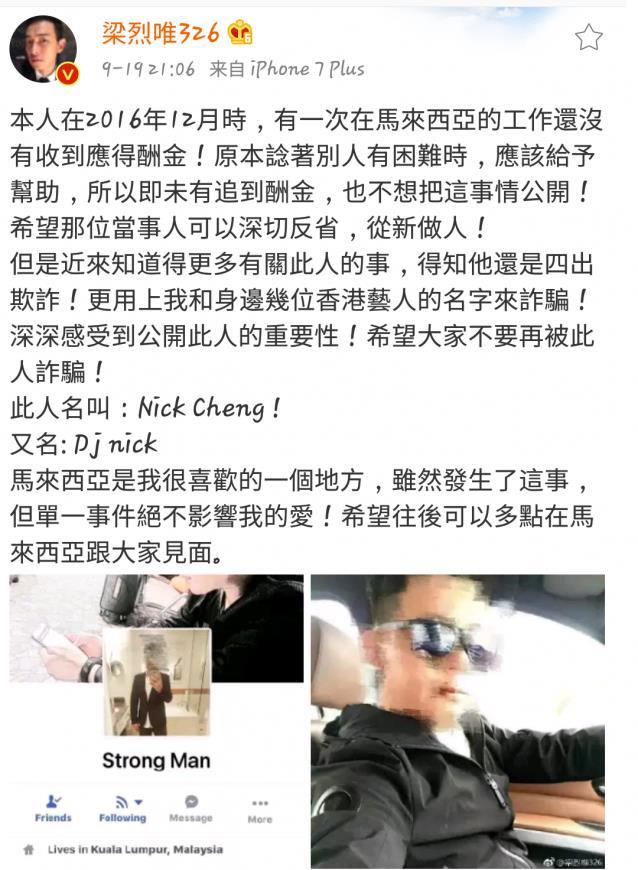 原來這個人利用藝人的相片到處招搖撞騙!梁烈唯更稱自己一度叫公司慢慢追酬勞,可惜發覺對方無意悔改,今年仍用他及其他藝人的名字,向其他投資方招攬生意。他續指李燦森、林子善也曾遇上同樣經歷,對方通常首次找藝人工作會付酬勞,從而往後用其名字招攬工作,但之前就會拖欠酬勞,又指知道對方仍用他名字招搖,希望其他投資方清楚知道他跟對方沒有任何關係。