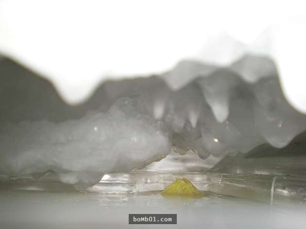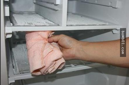 ▼過了幾分鐘,你會發現冰霜自行脫落,黏在冰箱冷藏室內壁的冰塊輕輕一剝就脫落啦!最後使用毛巾把冰箱內部融化的霜層擦洗乾淨就OK啦!