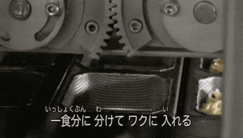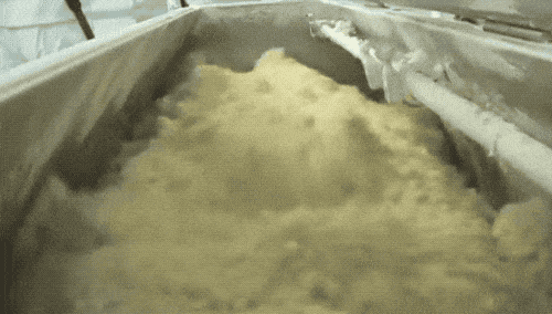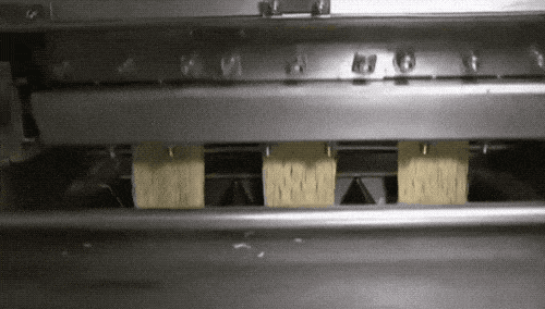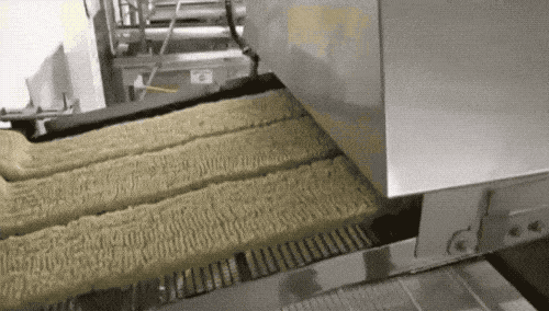 為了讓麵條呈現彎曲狀,把滾筒切刀再連接一個擠壓機,這樣切割成直的麵條通過路程彎曲的擠壓機之後,出來的麵條也就變成彎的了。你一定好奇泡麵為什麼要做成彎的,實際上是為了增加麵條和空氣接觸的面積,後面進行油炸和冷卻的過程就會大大的縮短時間。