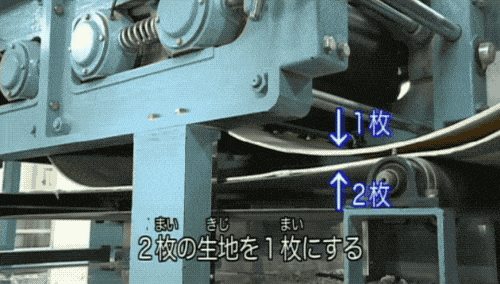 生麵團不斷的通過多個碾壓機,壓成一層麵皮,然後把兩層麵皮壓成一層,不斷地碾壓拉成,增加韌性。