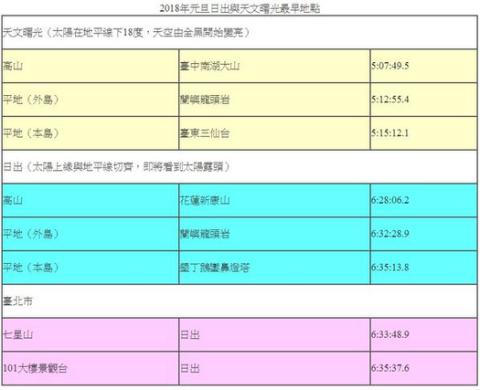 記者李鴻典/台北報導2017年倒數,再過一個月就要迎接2018年,想在元旦假期規劃新年曙光之旅嗎?台北天文館精算出2018年全國最早出現曙光的地點是台中市南湖大山,平地在蘭嶼龍頭岩,而台灣本島平地則在台東縣三仙台。搶先報名►12/6(三) 瑞銀2018年全球投資展望論壇Sponsored UBS瑞士銀行▲圖/翻攝台北天文館網站台北天文館指出,當太陽在地平線下18度,夜空從全黑開始變亮時,就是天文上的曙光出現時間。2018年元旦當日,台中市南湖大山海拔3,740公尺,在5時07分49.5秒出現曙光,是全國最早出現曙光的地點。若不算人跡罕至的高山,平地以蘭嶼龍頭岩的5時12分55.4秒最早,台灣本島平地的最早曙光在5時15分12.1秒出現於台東縣三仙台。▲圖/翻攝台北天文館網站