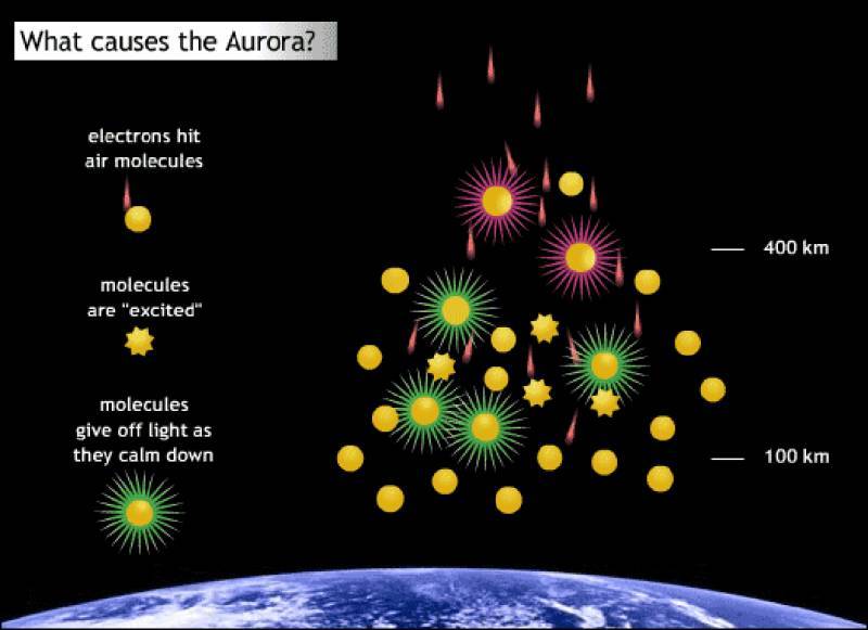 極光的形成:「太陽的日珥運動帶來的磁暴現象,吸引了無數帶電粒子飛向北極圈摩擦、碰撞、旋轉,每個粒子都攜帶了大量能量在大氣分子中從低能級激發至高能級受激發的電子很容易恢復原狀,好像變了模樣的小妖精遇到了孫悟空的金箍棒剛變成高能級就瞬間閃回基態。
