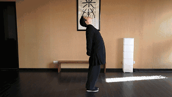 兩腿並攏,身體中正,雙手放到背後,手指交叉撐開,掌心隨即向下,手臂屈直,手心下按,頭後仰,身體後彎,隨將肩膀、胸部、腹部逐一打開,拉到即止,維持一分鐘再返回原處。