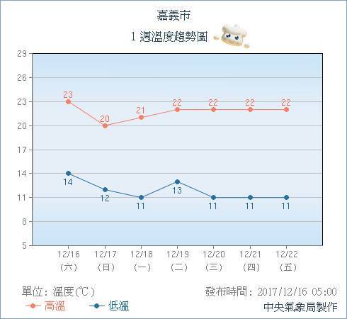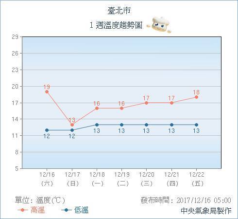 氣象局表示,下周一白天到下周二(19日)強烈大陸冷氣團會稍微減弱,但因為水氣偏多,沒明顯回溫,北台灣低溫持續時間長,氣溫約13至17度,中南部則是有時日夜溫差偏大;降雨方面,啟德颱風之外圍中高層水氣有機會被帶到台灣附近,水氣增多,所以除迎風面的北部及東半部地區有一些局部短暫雨外,中南部雲量亦增多,山區降雨機率提高。