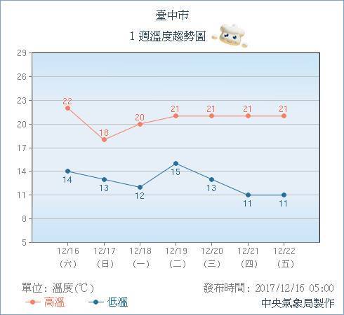 氣象局說,周日至下周一清晨是強烈大陸冷氣團影響最明顯,台南以北及東北部低溫將下探11至13度,中部以北沿海空曠地區可能還再低個1度左右,而高屏及花東也只有15、16度;高溫部分,北部白天高溫只有13至15度,感受偏冷,其他各地除高屏之外,也普遍不到20度;降雨方面,周日水氣逐漸減少,但迎風面的北部、東半部地區以及中南部山區仍會有一些局部短暫雨。