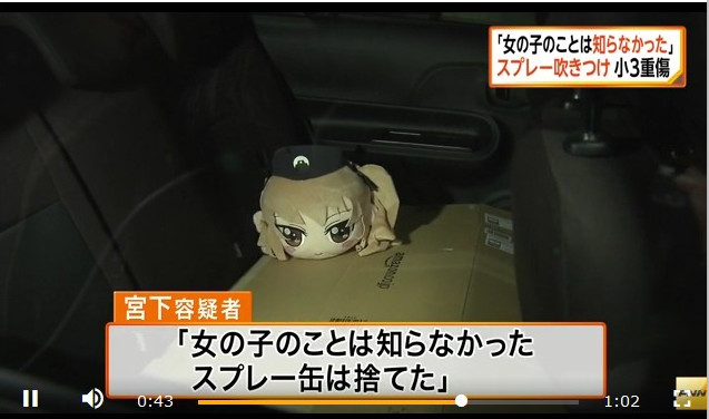 最近日本和歌山田邊市發生一起小學三年級女童被男子用催淚噴霧致傷事件,男子在12月20日被捕,一開始供述不知道對方是女童,但現在已承認接近女童是為了觸摸對方的身體。這名犯罪嫌疑人被以強制猥褻致傷嫌疑送檢。而在新聞報導時,嫌疑人車內出現一個《少女與戰車》島田愛里壽的娃娃,因此嫌疑人是《少戰》粉的說法被迅速傳播開來。