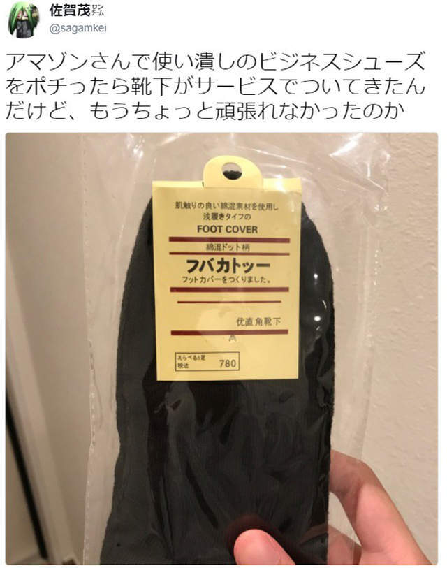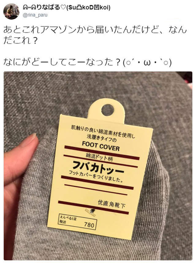 這位日本網友從網路購物買了鞋子,商家附送一雙隱形襪當贈品,然而這雙隱形襪的標籤明顯仿冒無印良品的設計,右下角不但以簡體中文寫著「優直角靴下」的奇怪字句,甚至連最重要的商品名稱都拼錯了!