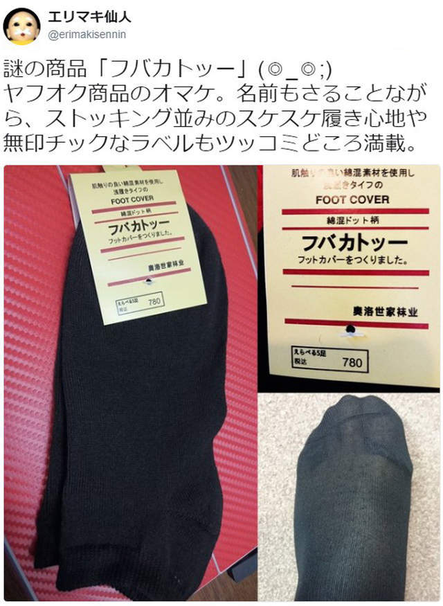 仿冒商將隱形襪(foot cover)的片假名「フットカバー」拼成「フバカトッー」,字母順序完全錯亂而且變得不知所云了!