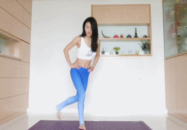 動作要點:雙腳打開,盤骨闊度,雙手放腰側,然後將一隻腳踏向另一隻腳外的位置,前腳掌著地,屈曲雙膝,做20次。