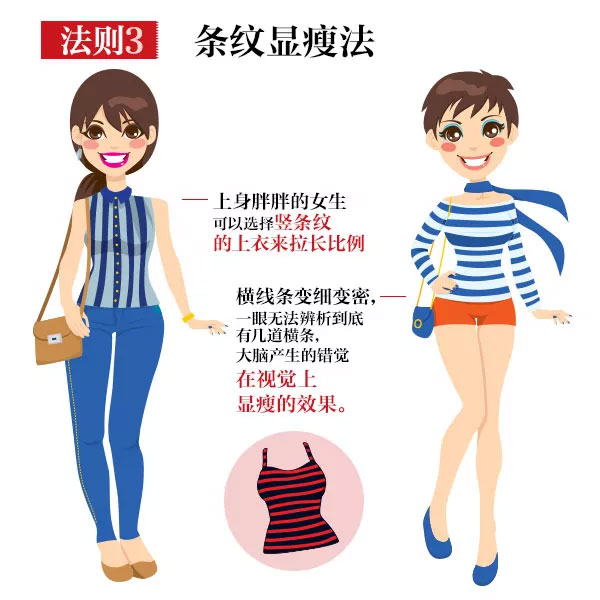 上身胖胖的女生可以選擇豎條紋的上衣來拉長比例,但真的是豎條紋才能顯瘦嗎?很多美眉聽到橫條紋就立刻想到“顯胖”,其實未必。事實上,橫條紋運用得當的話也會出現顯瘦效果。