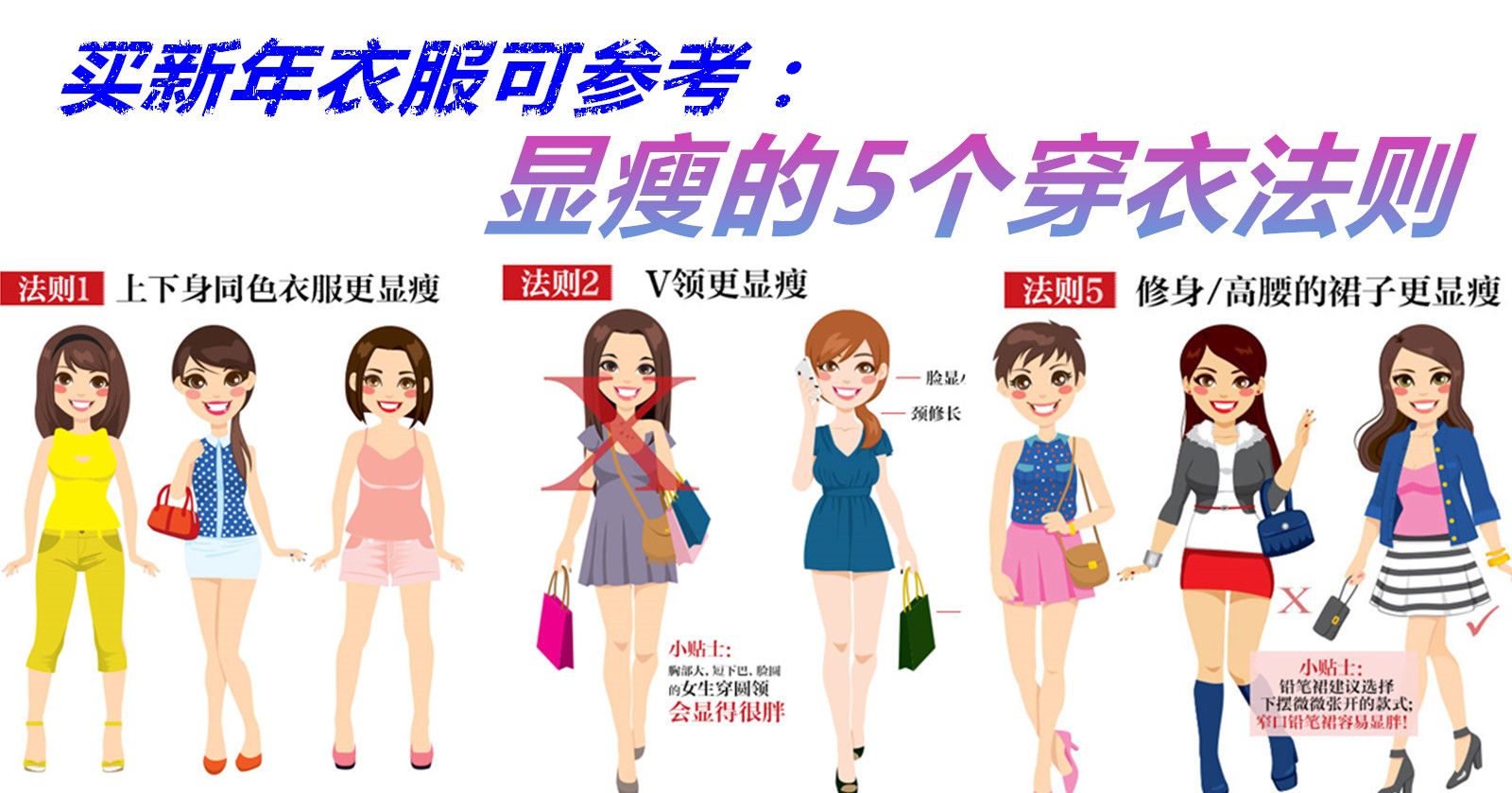 農歷新年即將到來,你已經開始購買新年衣服了嗎?每年的農歷新年期間,和親戚或者朋友去拜年或集會時,其實也像個時裝秀,每個人都希望自己的穿著時最時尚和好看的。尤其是女生,最怕自己穿了個不適合的衣服,反而顯胖了。這裡有幾個顯瘦的穿衣法則絕對可以幫到你!