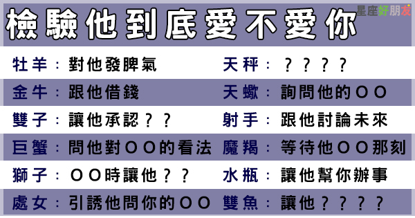 獅子座其實很難會輕聲細語的幫你端茶倒水,做點打雜的小活,如果你生病了,絕對是個考驗他愛情的好時機,如果他表現得關切無微不至,不用說,他絕對視你為珍寶,要是只應付了事,那麼你也就該找個時間跟他say goodbye了。