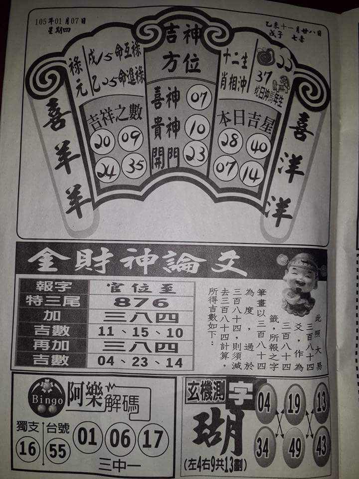 今彩539 2020/10/07 吉祥報分享 供您參考
