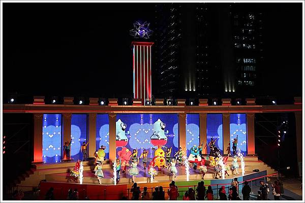 沿著地上的彩虹走,會到這個舞台「慶典廣場」,在樂園要結束前17:30-18:00間會有演唱會規格的兒童劇場喔