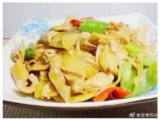 2、鍋加油燒熱,爆香薑末,加入豆筋煸炒後,再加入其他材料一同翻炒,加鹽、醬油、蘑菇精調味,即可出鍋。