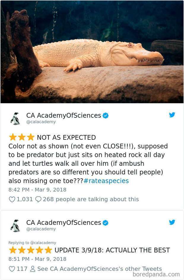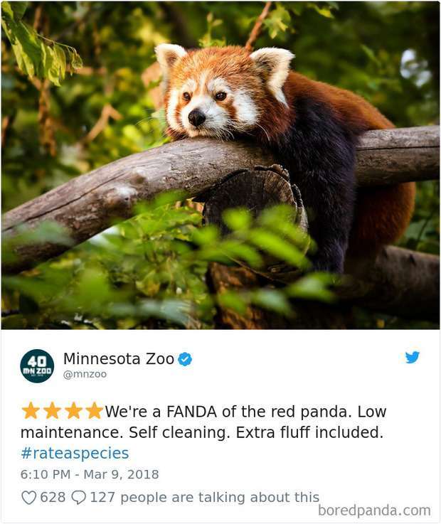 在這個網購盛行的年代,我們習慣買東西之後都會先看一下物品和賣家的評價,可是為動物「評價」的做法你有看過嗎?美國俄勒岡動物園(Oregon Zoo)突發奇想,在社群網站上以幽默的方式為動物們「評價」,引起了許多網友的好奇心,也吸引了許多網友紛紛前來幫動物們「評分」,讓動物園的生意也因此大增!一起來看看這些有趣的「評價」吧:
