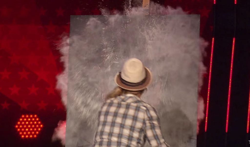 將畫布顛倒過來,撒上一些粉筆灰,整個畫面結果就完全不同了!這個才華洋溢的瑞士女畫家同時畫了兩個評審的畫像!從不同的角度看,完全成了差異極大的另一個人。難怪評審們都後悔了他們的倉促決定,讓 Corinne 進入下一輪的決賽。果然是精彩的表演阿!