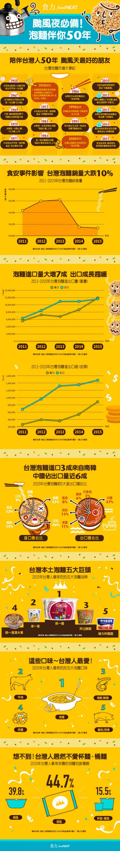 至於台灣消費者最常吃的前五大泡麵品牌中,以統一公司旗下品牌佔比最高,高達6成;統一公司2015年年報也統計出旗下泡麵2015年國內銷售額高達39億2900萬元。