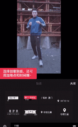 然後還可以為視頻選擇創意貼紙,在界面中添加時間和地點,再選擇一首合適的背景音樂,最終的超能力視頻就製作完畢了,上傳分享到你的朋友圈或者其他平台,說不定你就徹底火了,然後出任CEO,贏取白富美,走向人生巔峰!