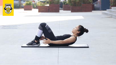 注意事項:兩腳之間的距離為一個拳頭左右大小,膝蓋間的距離也為一個拳頭大小。腳後跟距離臀部的距離約為兩個拳頭大小。手臂伸直,手掌放在大腿處。呼氣的時候,將上背部抬離地面,帶動手臂,讓手掌去觸碰膝蓋。注意下巴微收,頭部不可過度抬起,避免頸椎受傷。