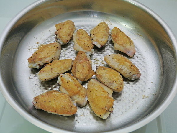 熱鍋後不放油,將雞翅雞皮面朝下先煎,煎至兩面金黃後取出備用。