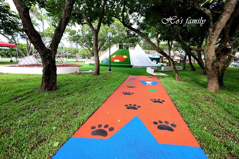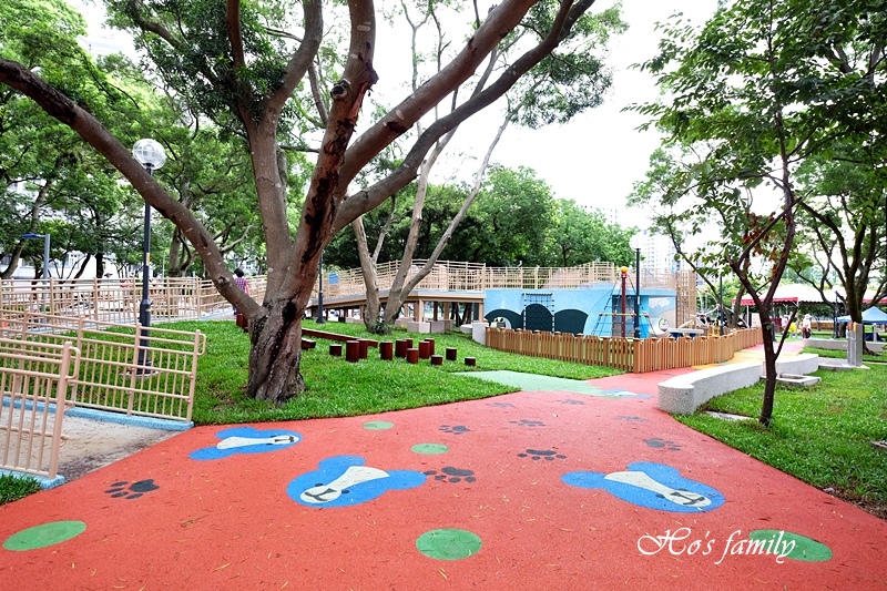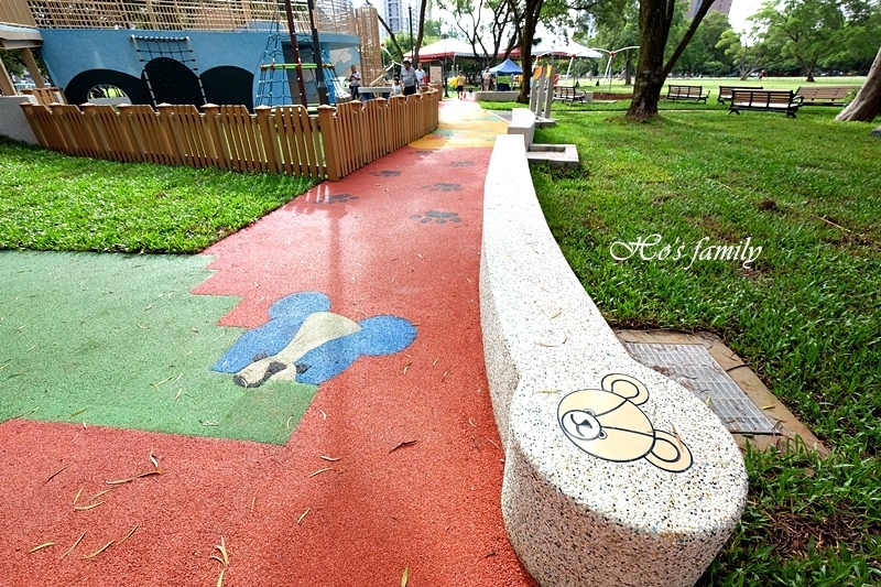 這邊可以明顯看到小熊步道以顏色區分各個不同的遊樂區域。為了怕狗狗跑進去,林口公鄰23公園有特別設置矮圍欄可以關起來,不用擔心玩沙時挖到便便,超聰明的設計啊!